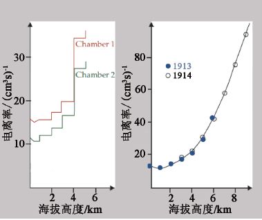 在20世纪初期,很多欧洲和北美的物理学家都为大气电离研究做出过重要贡献.最主要的仪器是放在密封容器中的验电器.随着绝缘性能的改进和验电器灵敏度的提高,放电率可以测得很准.威耳逊等人很快发现,电离一定来自密封瓶外,辐射要么是X 射线,要么是毭射线.威耳逊这时还提出,这个辐射也有可能来自地球外.卢瑟福等人在1903年发现,验电器用无放射性金属屏蔽后,电离会减少.因而密封容器中的电离至少有一部分是由于某种穿透性的辐射.当时流传的观点是,这种辐射来自地壳中的放射性物质,并应该随高度增加而减少.