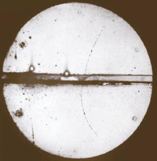 图2 一张有历史意义的云雾室照片,由卡尔·安德森1932年拍摄.照片显示一个可能来自于宇宙线簇射的正电荷粒子,从上面进入,被云雾室的横向磁场打弯,最后在铅板中丢失了能量.这是首次看到保罗·狄拉克1928年预言的正电子