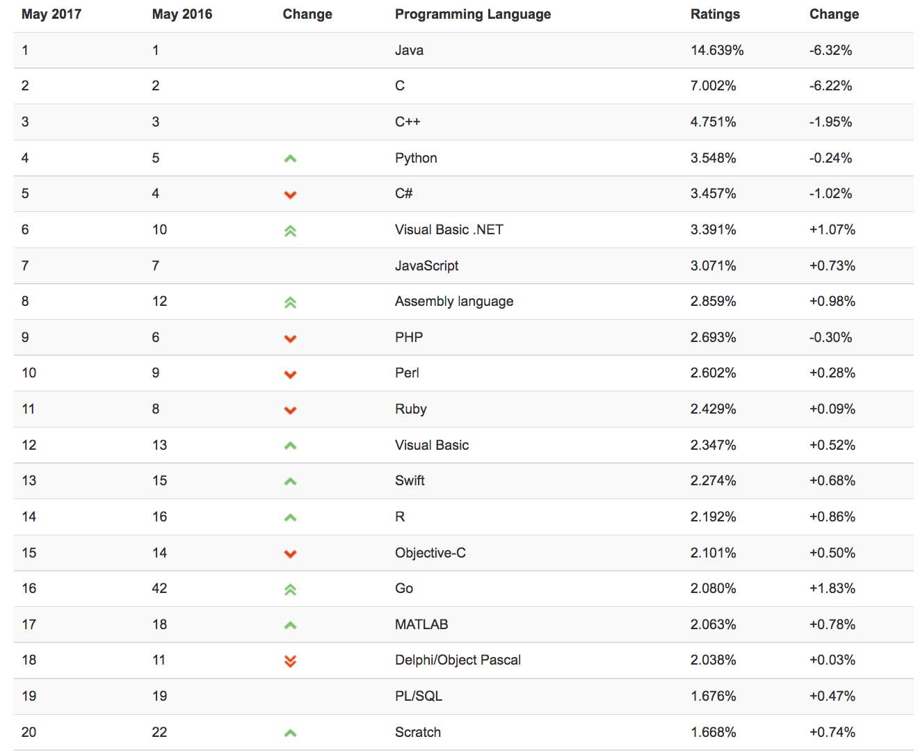 TIOBE 公布了5月编程语言排名,下图是进入前20名的