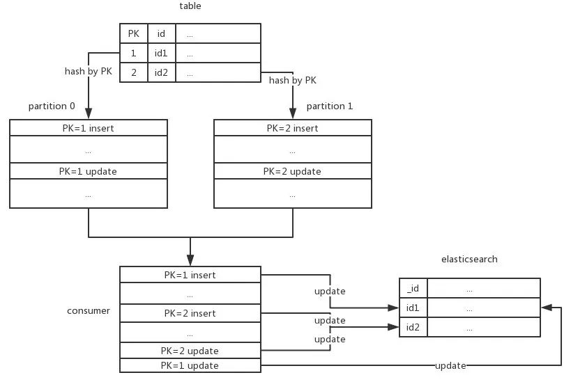 如果是多 Consumer 的情况,一个 Partition 只会分配给一个 Consumer,同样可以保证 Partition 内的数据可以有序的 Update 到 Elasticsearch 中。
