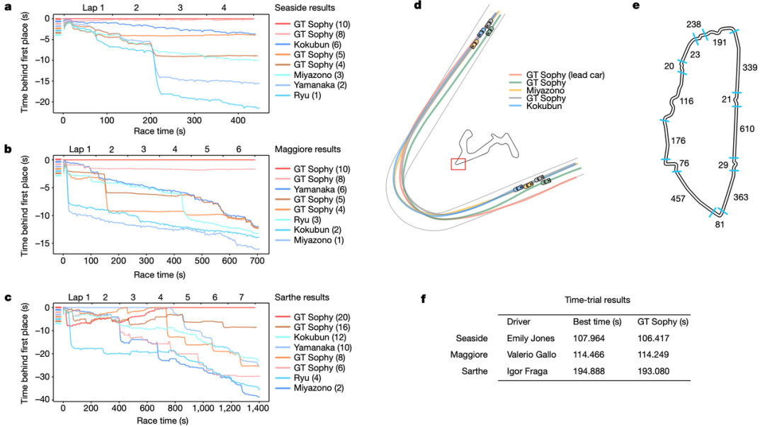 为了评估 GT Sophy,研究人员在两项赛事中让 GT Sophy 与顶级 GT 车手进行了较量,GT Sophy 在所测试的三条赛道上都取得了超人的计时表现,它能够执行几种类型的转弯,有效地利用漂移,扰乱后面车辆,拦截对手并执行其他紧急操纵。