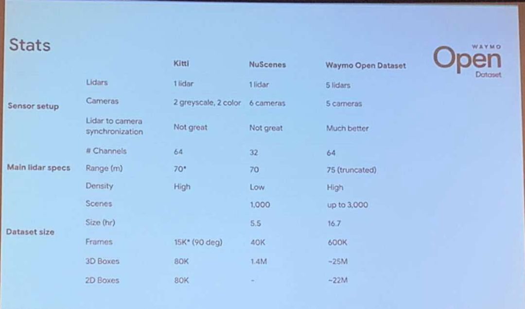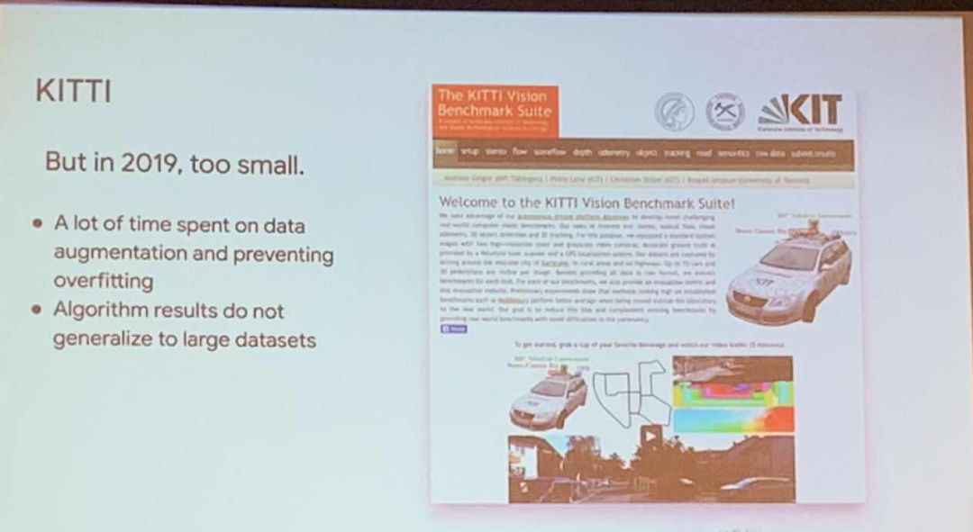 但在自动驾驶创业公司代表 Waymo 看来,到了 2019 年,KITTI 这样的数据集已经太小了,在使用过程中需要大量的时间做数据增强、防止过拟合,算法结果也不能很好地泛化到更大数据集上。