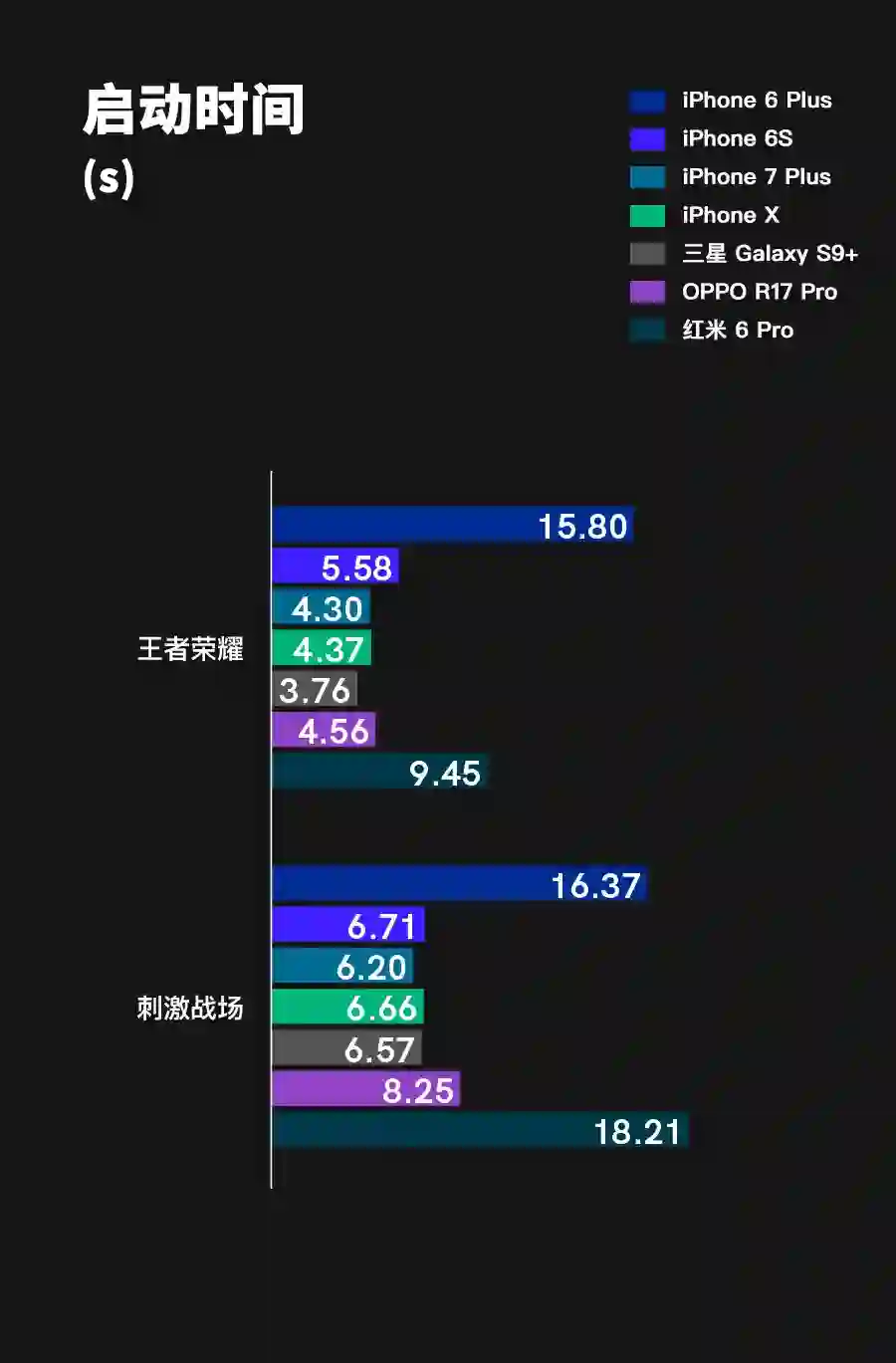 最后是游戏日常游戏类 APP,本次测试选取了王者荣耀和绝地求生:刺激战场。这一项就能明显看出各代 iPhone 之间的差距了,只有 iPhone 7 Plus 和 iPhone X 能够跟上安卓旗舰 Galaxy S9+。