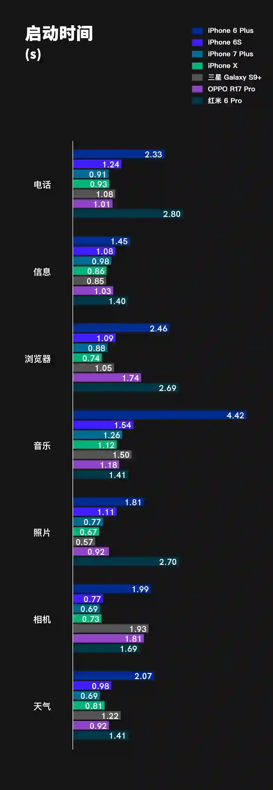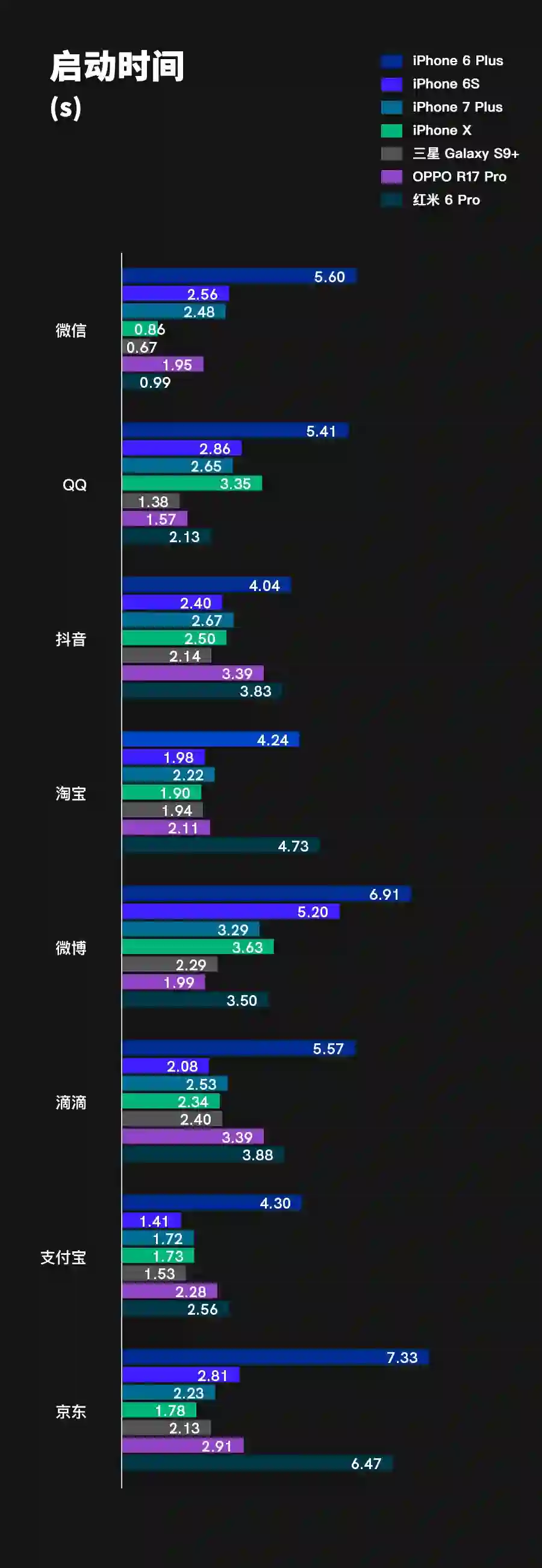 可以看到,上一代的 iPhone X 在第三方 APP 冷启动面对安卓旗舰三星 Galaxy S9+ 是不相上下,再前代的机型 iPhone 6S 与 iPhone 7 Plus 则与目前采用骁龙 710 的 R17 Pro 比较接近。4 年前的 iPhone 6 Plus 有些项的表现比红米 6 Pro 还要差。