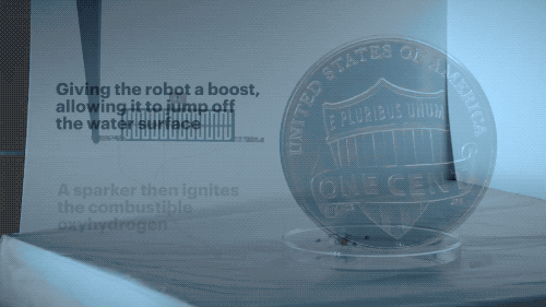 要知道,水的表面张力比 RoboBee 自身的重量还要高上许多,「进入水中」首先就是个难题。为此研究人员给机器人增加了漂浮装置,以及一个气体收集器,内部的电解板会把水分解,由氢氧组成的天然气燃料会提供动力,将 RoboBee 送入水中。这实际上是把水作为能源,让 RoboBee 像火箭一样在水和空气中来回穿梭。蜜蜂机器人从此有了「上天入海」的能力。