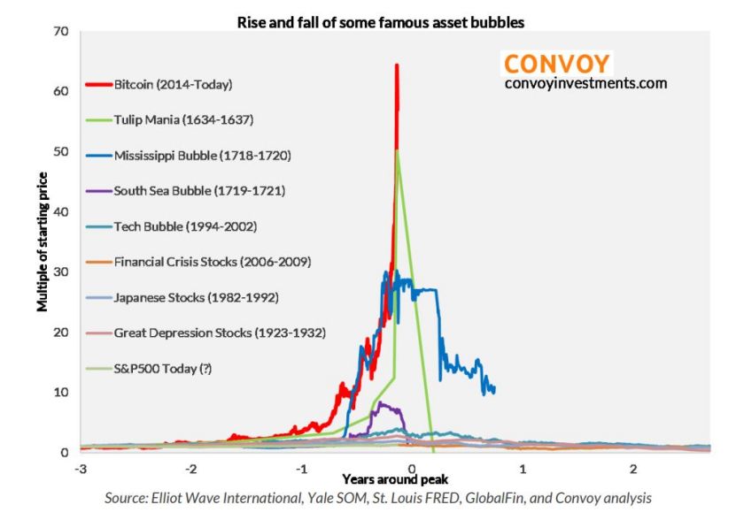 要知道在2010年,一份价值25美元的披萨就花掉了买主1万枚比特币,相当于一枚比特币价值0.25美分。七年时间身价暴涨400万倍,使得比特币超过荷兰“郁金香狂热”和英国“南海公司骗局”,成为人类历史上最大的一次资产泡沫。