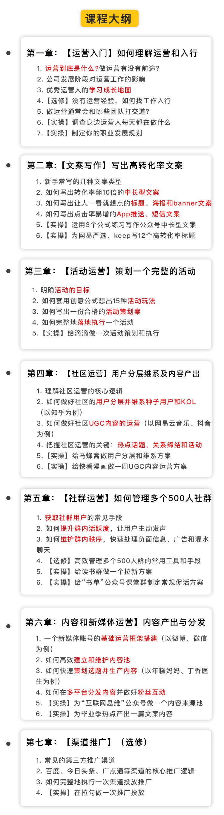 课程极其注重落地和实操,能够全方位帮助小白了解运营工作的基础内容和方法,并且手把手教你如何落地执行、如何一步步完成leader交代你的任务。
