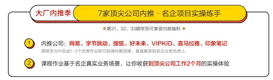 如果你能够凭借自己的努力成为优秀学员,就有机会获得直接内推到VIPKID、字节跳动、喜马拉雅、搜狐、网易、好未来(学而思)和印象笔记等诸多大厂的机会。