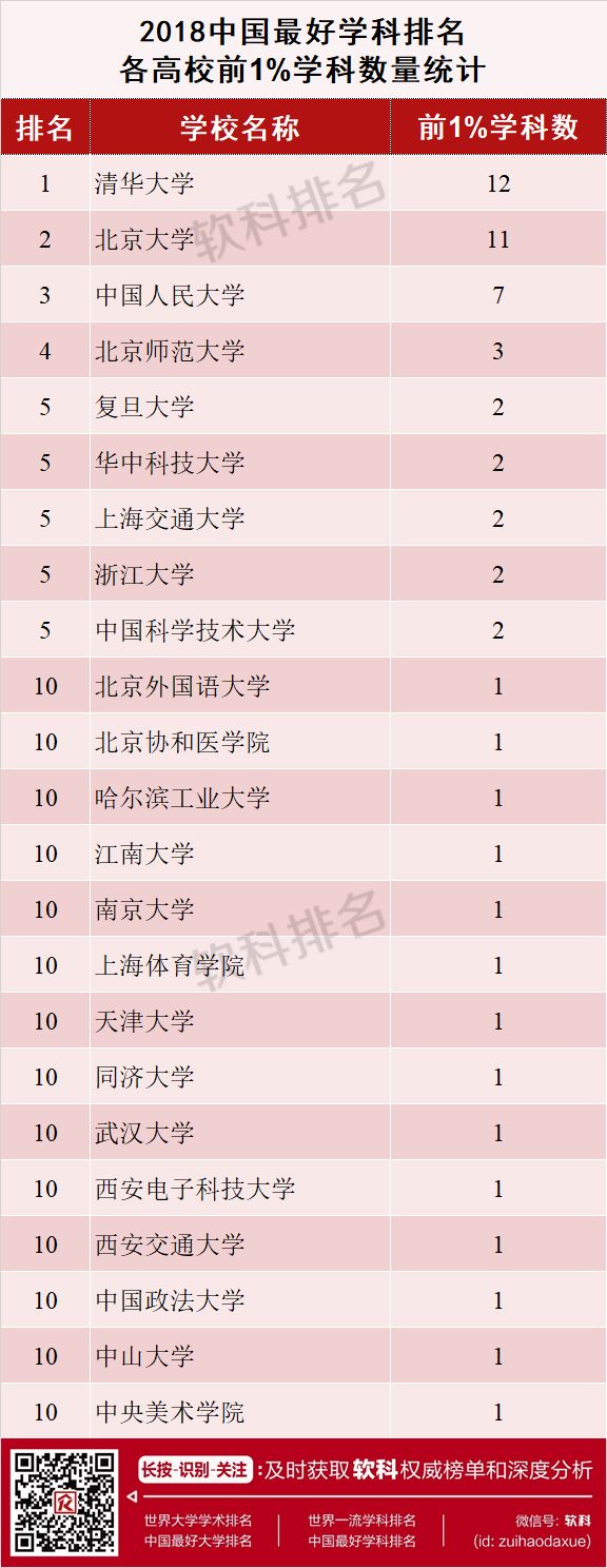 根据统计,共有23所大学的57个学科点入选全国前1%学科。清华大学以12个全国前1%学科成为各校之首。北京大学有11个前1%学科,比2017年多了3个,紧跟其后。中国人民大学有7个,名列第三。北京师范大学有3个学科点入选前1%学科,排在第四。复旦大学、华中科技大学、上海交通大学、浙江大学和中国科学技术大学各有2个学科点成为全国前1%,表现出众。