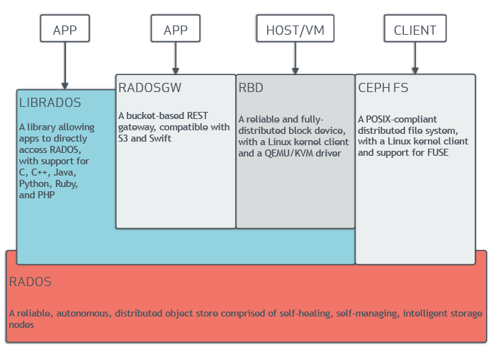 Ceph架构相当复杂的,其中使用到大量的底层技术,例如RADOS、librados、RADOSGW、RDB、CRUSH算法,外加monitor、OSD以及MDS等功能性组件。这里我们先不谈它的底层架构,关键在于Ceph属于一种分布式存储集群,这使得扩展更便利、能够在不牺牲性能的前提下消除单点故障,且提供涵盖对象存储、块存储以及文件存储的统一存储体系。