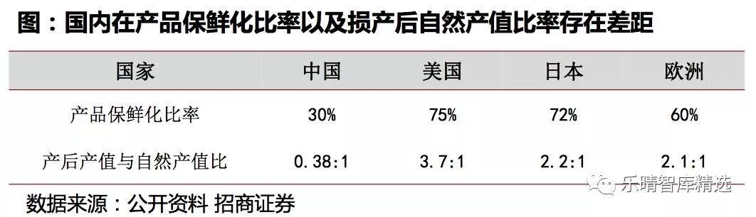 国内生鲜整体损耗率水平较高,中国农产品冷藏加工与其他国家相比,产品保鲜化运输比率较低,而欧美日等成熟国家的产品保鲜化比率水平较高,整体维持在60%以上;而根据产后产值与自然产值的比率,中国:美国:日本:欧洲=0.38:37:2.2:2.1;整体水平提升空间大。