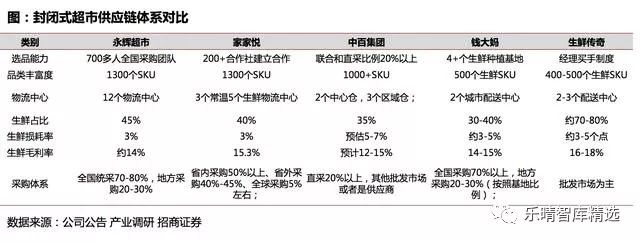 永辉超市:1、门店拓展至全国,核心解决了供应链问题,全国采+本地采能够解决;2、生鲜品类上足够齐全,肉制品(白条采购等)、水果(全国采购)、蔬菜(本地采购)以及水产品(沿海运输)等;3、前台管理解决,拥有较强的标准化管理体系,全国12个物流中心;4、选品、物流、基础设施齐全。标杆企业—家家悦:构建区域供应链体系
