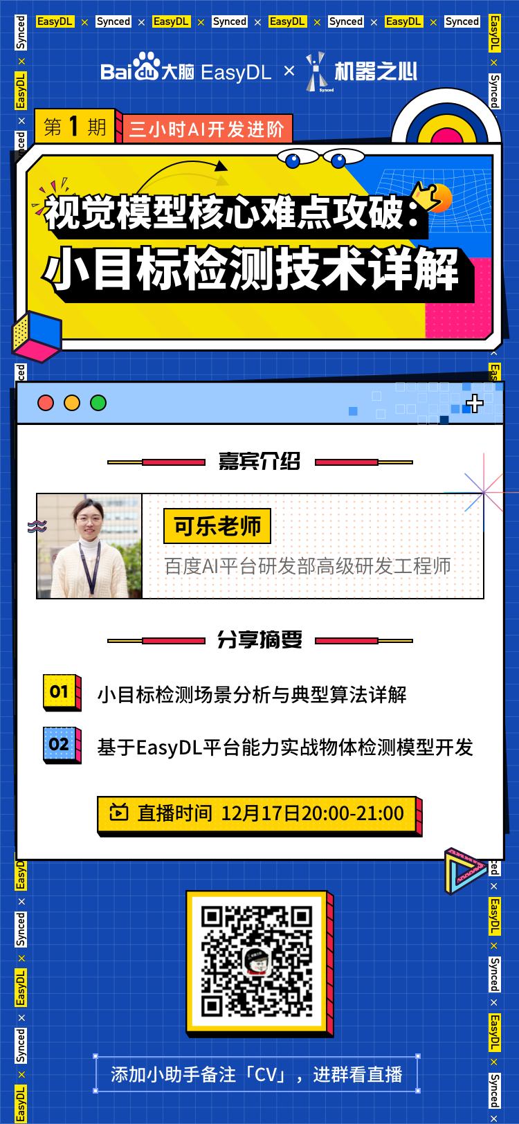 「三小时AI开发进阶」公开课上线!本周四(12月17日)20:00,百度高级研发工程师可乐老师将在第一课《小目标检测技术详解》中介绍: