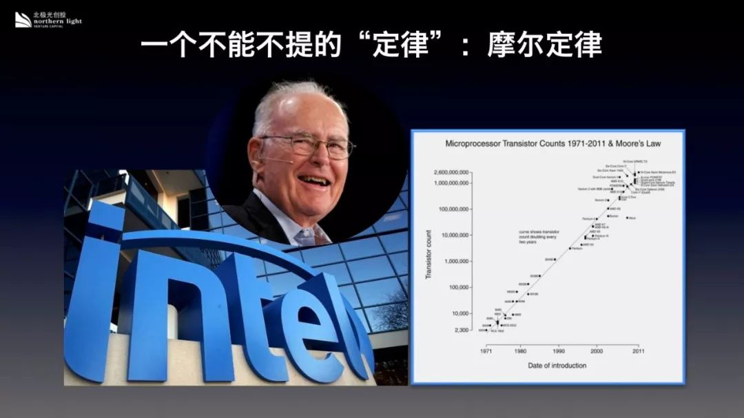 提到半导体,不得不一位老先生摩尔,摩尔定律其实不是一个定律,讲的是半导体单位面积里面的晶体管,大概每18-24个月翻一番。