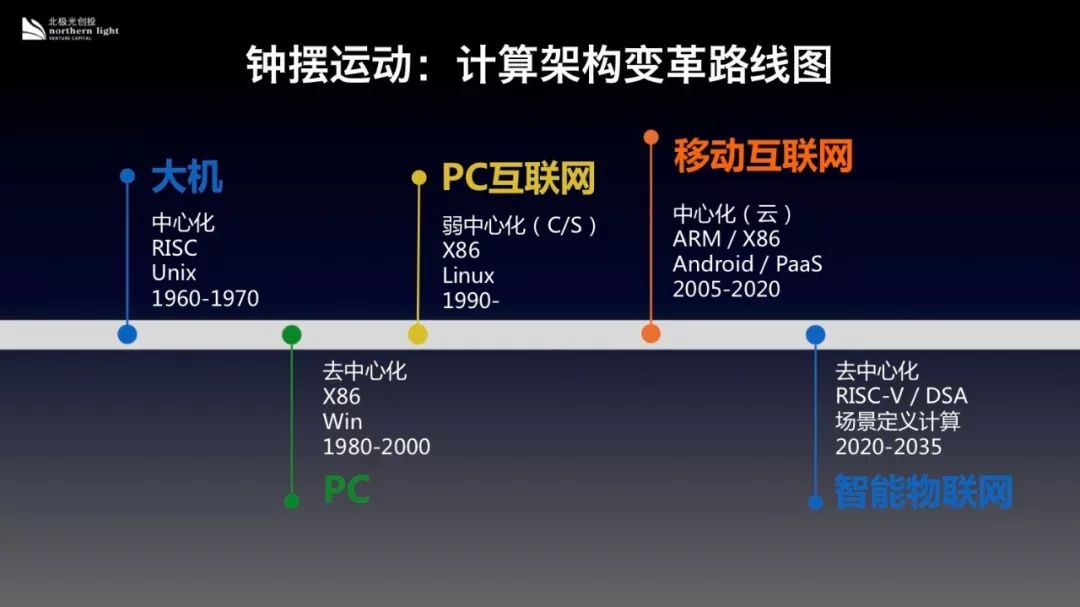 这个是赵顾的PPT,总结得非常好,整个计算架构其实像钟摆一样在不断的摆动,这里面有两个特点,第一个特点就是从IBM的大机时代,到了PC的去中心化时代,到了PC互联网的弱去中心,到了移动互联网的强中心,它在摆动。