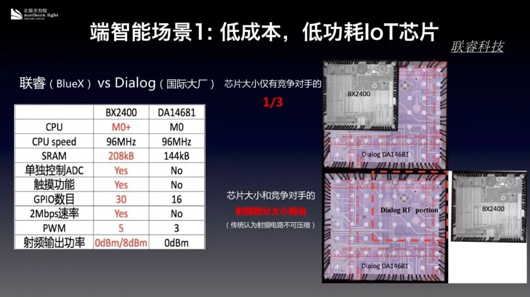 当初跟一位创始人交流的时候,说可以把RF部分做到别人的七分之一,让我非常的吃惊。他们做了一个芯片,联睿(BlueX)比竞争对手多40%,在多40%的情况下,芯片的大小只有别人的三分之一,现在华米把这个芯片用到他们的手环和一系列的产品上面。这是硬件。