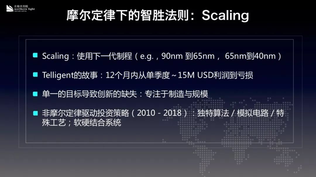摩尔定律有它的优势,简单,但其实也很粗暴,因为在这个粗暴之下,创新变得不那么重要了,在这种时候更大的价值是规模和制造。北极光也有惨痛的教训,这里面给大家列的是我投资的公司,曾经在摩尔定律的作用下,因为稍微晚了一拍,净利润从一个季度的1500万美金到一年之后变成了0,最后不得不卖给另外一个厂家,本来可以成为独角兽的。