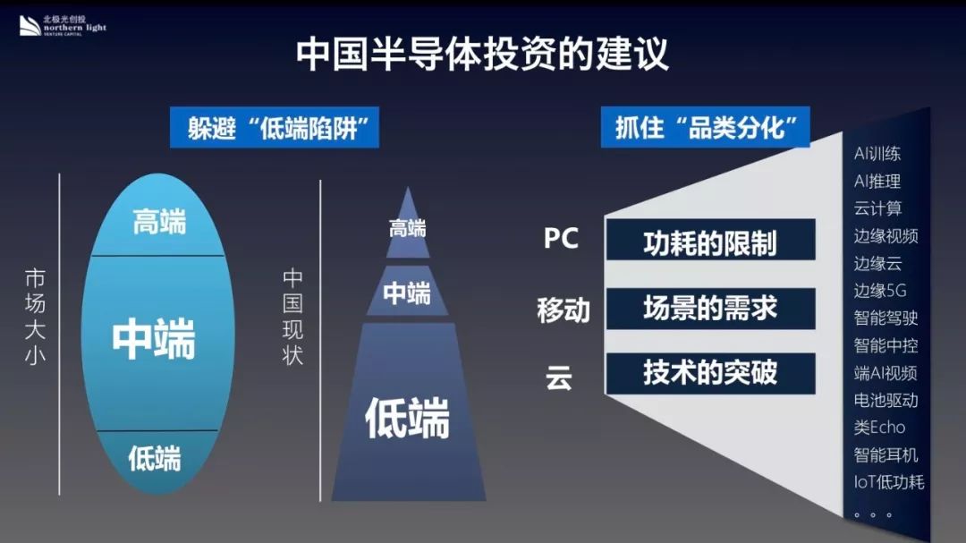 4、在中国 " 造芯热 "的背景下,创业者和投资人都需要注意:躲避低端市场陷阱、捉住品类分化的机会、掌握独特的核心IP。