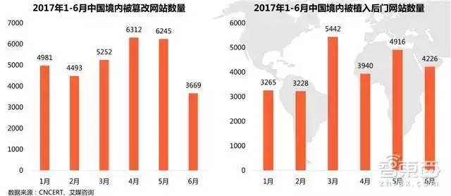 数据显示,2017年上半年,中国境内被篡改的网站数量在3500至6500个之间,被植入后门网站数量在3000至5500个之间,被篡改和被植入后门网站主要为商业类网站。
