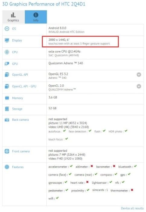 HTC已经宣布将于11月2日在台北举办新品发布会,U系列旗舰U11 Plus届时将正式亮相。现在关于这款新机的细节信息陆续揭晓,继GeekBench曝光HTC U11 Plus参数后,知名跑分网站GFXBench上也出现了这款设备。GFXBench显示,HTC U11 Plus型号为2Q4D1,它采用了6英寸显示屏,分辨率为2880×1440,屏幕纵横比为18:9,搭载骁龙835处理器,配备4GB内存+64GB存储,前置摄像头为800万像素,后置摄像头为1200万像素。