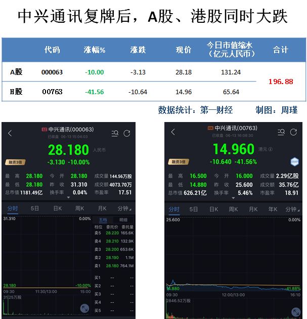 这还没完,今日(6月13日)中兴通讯复牌后,A股、港股同时大跌。截至收盘,中兴通讯A股跌停,没有涨跌幅限制的港股大跌41.56%。A股+港股合计蒸发196.88亿市值,相较于14亿美元(89.73亿元)的罚款还要多107.15亿元。