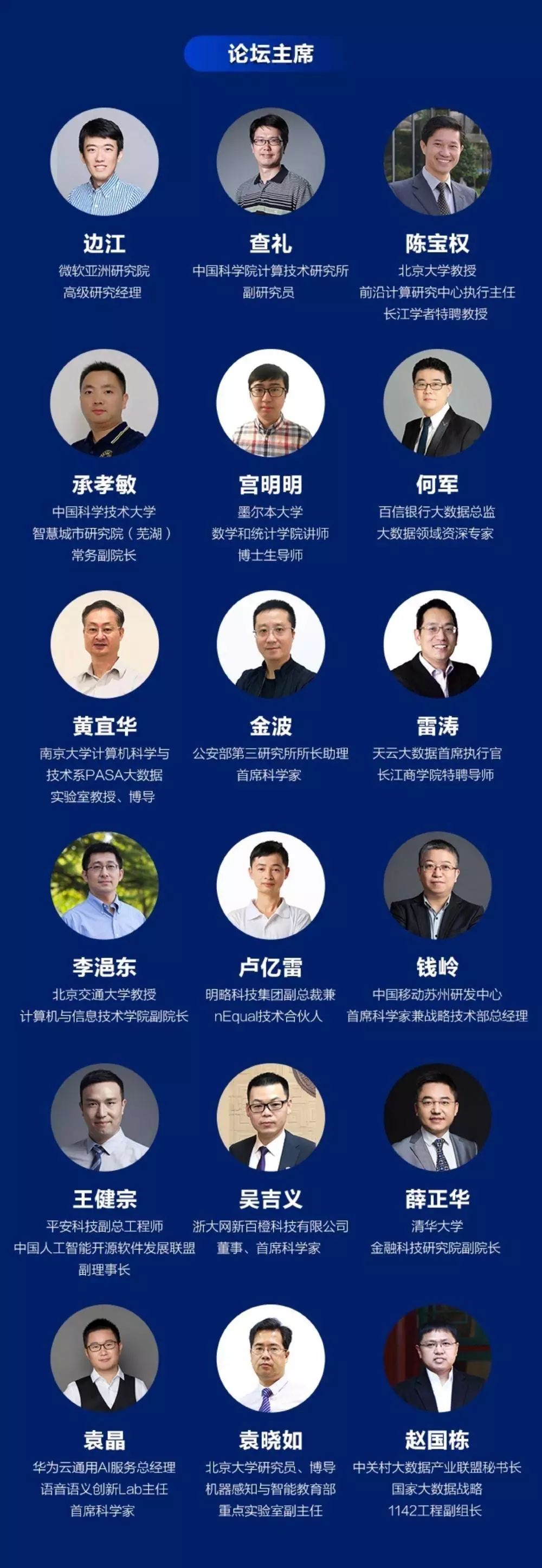 2019 年中国大数据技术大会汇集了政产学研 20位专家学者组成大会主席团、大会程序委员会及论坛主席团,届时,百余位技术专家及行业领袖将齐聚于此。豪华主席阵容,成就了BDTC大会的高水准。