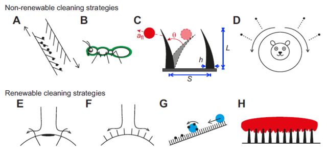 胡立德总结的8大方法分别是(A)刷;(B)分泌液体;(C)弹毛;(D)甩;(E)改变风向(睫毛);(F)改变风向(复眼毛);(G)莲叶效应;(H)蝉刺针。然而这个画风……丨论文原图