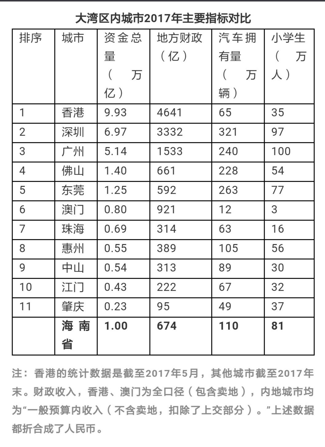 2017年大湾区各城市资金总量对比,排列由强至弱如下: