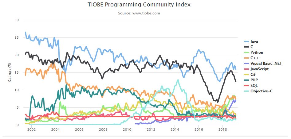 TOP 10 编程语言 TIOBE 指数走势(2002-2018)