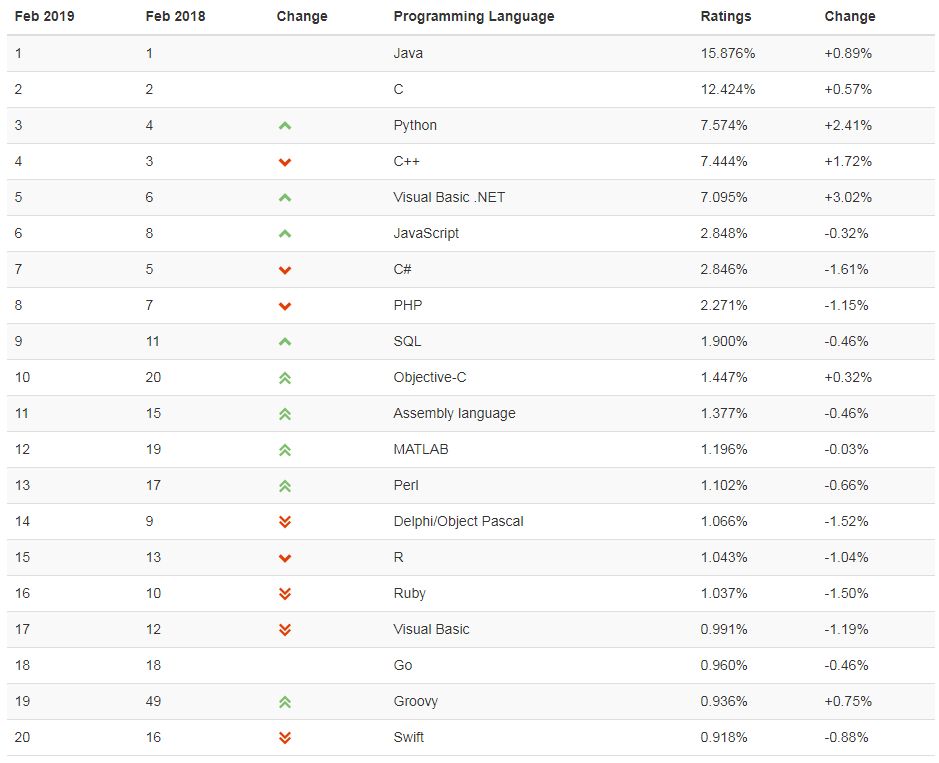 2019年2月编程语言排行榜 TOP 20 ——