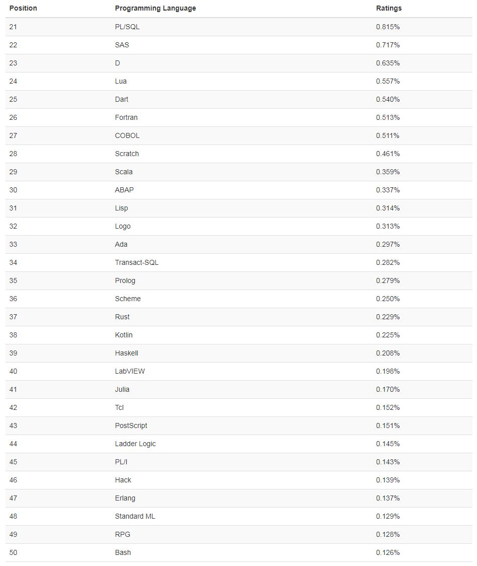 21-50 名的编程语言排行