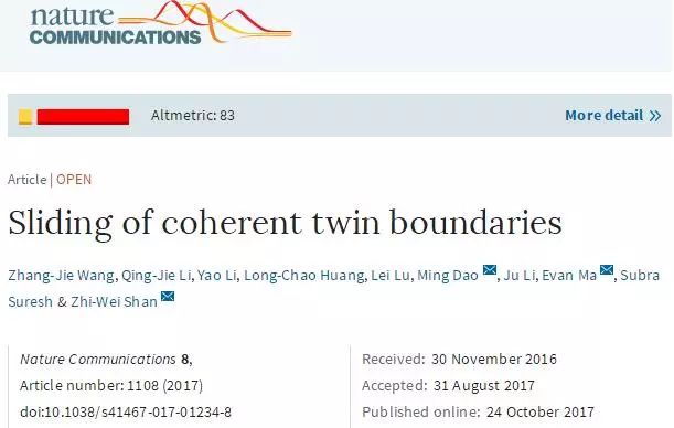 近日,《Nature Communication》杂志以研究论文形式(Article)刊登了西安交通大学材料学院微纳尺度材料行为研究中心单智伟教授研究团队的研究成果——共格孪晶界在合适加载条件下将发生滑移变形,推翻了此前人们认为共格孪晶界不可以发生滑移的认识,更新了人们对共格孪晶界变形的认知。