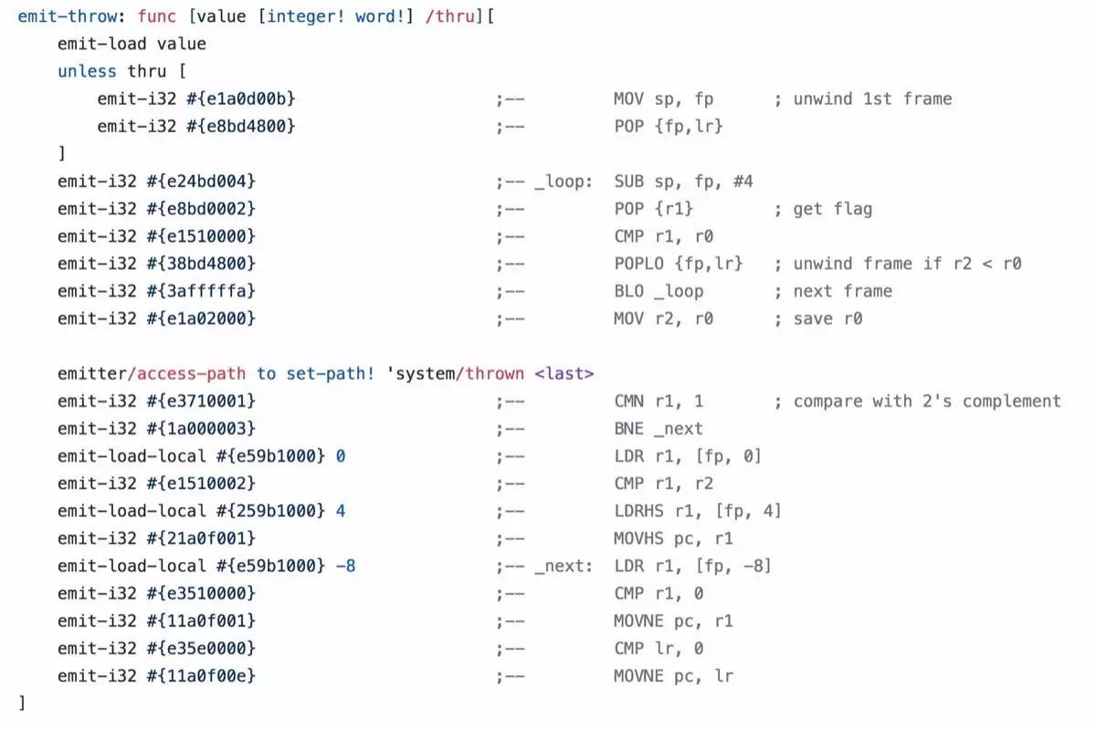 大多数语言,编译出来的目标代码连语言他爹都不是特别清楚会长什么样,可 Nenad 竟然匪夷所思且丧心病狂地为 red 手写 arm/ia32 的 assembly / machine code(见:https://github.com/red/red/blob/master/system/targets/ARM.r),其功力可见一斑。比如这个 throw exception 时的 stack unwind: