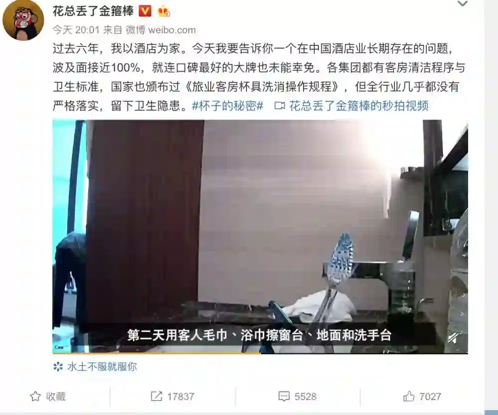 11月14日晚,微博认证用户“花总丢了金箍棒”发了一条11多分钟的视频,讲的是他过去一年拍的五星级酒店的工作人员是如何打扫酒店房间卫生的,有的甚至用同一条毛巾擦完洗手盆擦杯子擦镜子擦马桶……