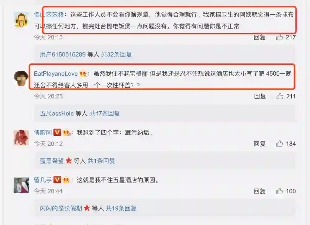 同样是万豪集团的,上海宝格丽酒店,这家奢侈品牌同名酒店4500元/晚,服务员从垃圾桶里回收一次性的塑料杯盖用自己的T恤擦一下重复使用,用客人擦过脸的小方巾擦杯子和洗手台;