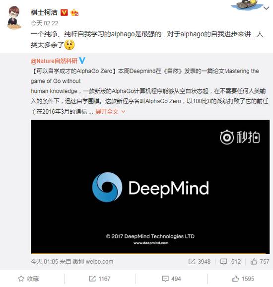 对此,柯洁当天就发了个微博称:“一个纯净、纯粹自我学习的 alphago 是最强的...对于 alphago 的自我进步来讲...人类太多余了。”