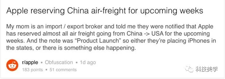 另外据Reddit用户爆料,苹果近期已经定下了未来数周几乎所有从中国飞往美国的货运航班,该用户称他妈妈是一个进口/出口经纪人,她透露称所有这些被苹果预定的货机还均贴上了“产品发布”(Product Launch)的字样。