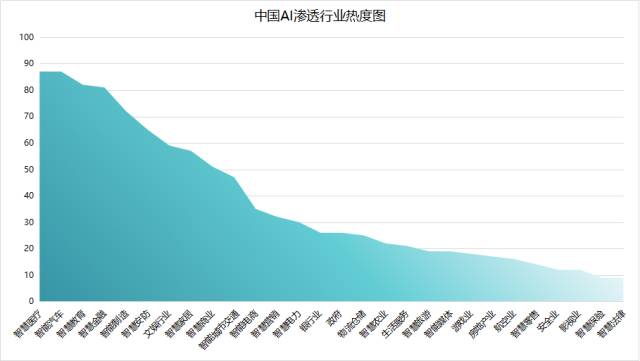 根据此前腾讯研究院发布的《中美AI创投报告》中整理的中国AI渗透行业热度图显示,医疗行业成为目前AI应用最火热的行业,汽车行业借势自动驾驶/辅助驾驶等相关技术的发展脱颖而出,位列第二。第三梯队中包含了教育、制造、交通、电商等实体经济标志性领域。在各行各业引入人工智能是一个渐进的过程。
