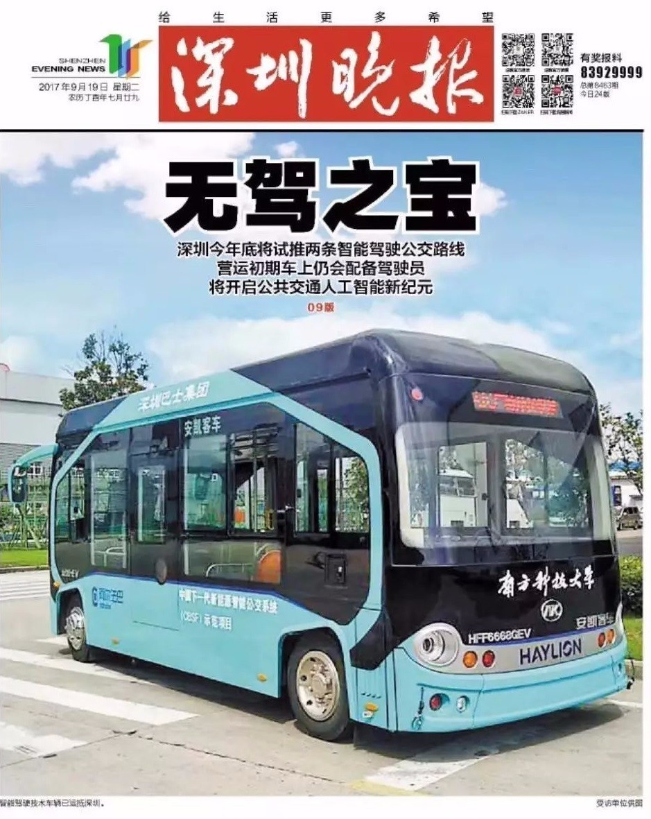 北京时间 9 月 18 日,在深圳市 2017 年「公交出行宣传周及无车日」启动仪式上,深圳巴士集团董事长余钢透露,将与国家智能运输中心、华为公司等合作,共同研发无人驾驶技术,今年 10 月底将在南科大等地实验两条智能驾驶路线。
