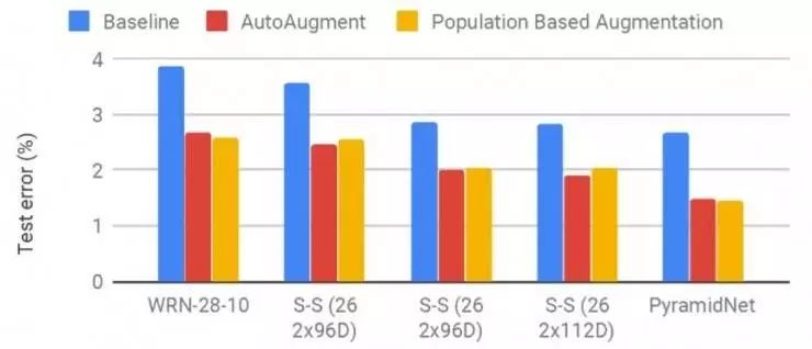 在 WideResNet(https://arxiv.org/abs/1605.07146),Shake-Shake(https://arxiv.org/abs/1705.07485),以及 PyramidNet(https://arxiv.org/abs/1610.02915)+ShakeDrop(https://arxiv.org/abs/1802.02375)模型上运用 PBA、AutoAugment 以及仅仅使用水平翻转、填充和裁剪等操作的对比基线时,各自在 CIFAR-10 测试集上产生的误差。