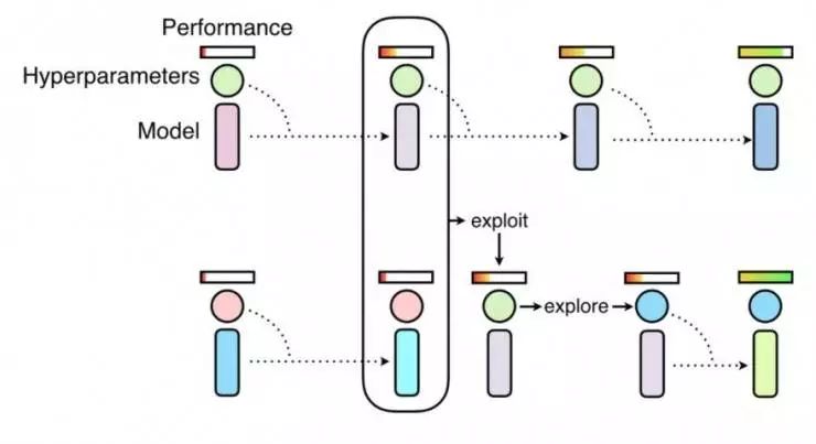 基于种群的训练示意图,它通过训练一个神经网路的种群来探索超参数计划。它将随机搜索(探索)和拷贝高性能个体的模型权重(利用)结合起来(https://deepmind.com/blog/population-based-training-neural-networks/)。