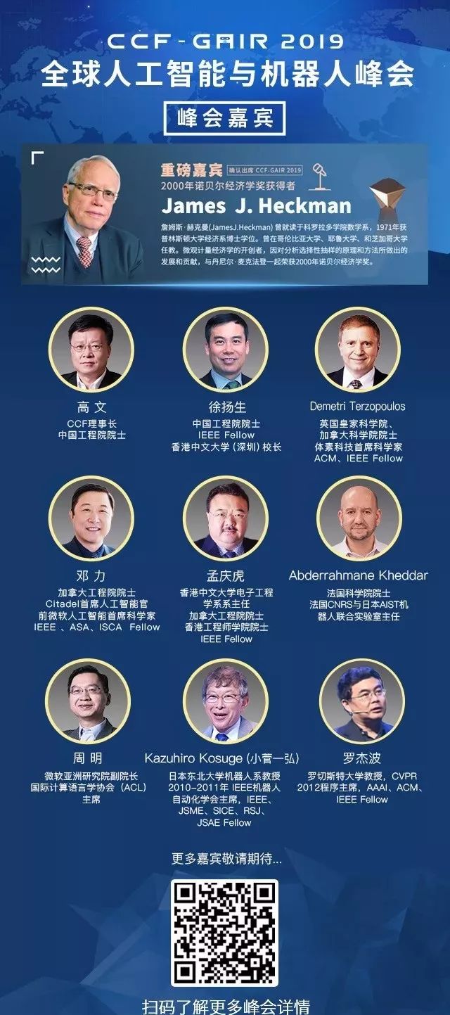 届时,诺贝尔奖得主JamesJ. Heckman、中外院士、世界顶会主席、知名Fellow,多位重磅嘉宾将亲自坐阵,一起探讨人工智能和机器人领域学、产、投等复杂的生存态势。