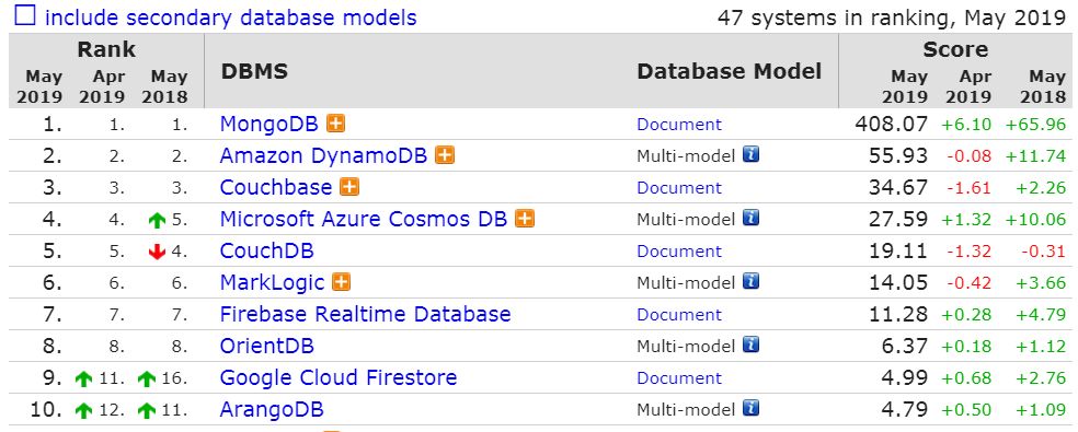 文档数据库前 10 名如下: