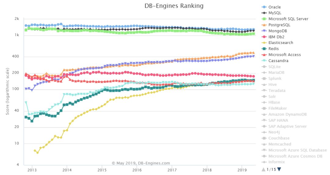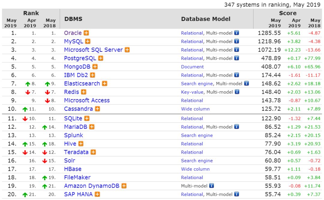 DB-Engines 数据库流行度排行榜发布了 5 月份的数据,排名前二十如下: