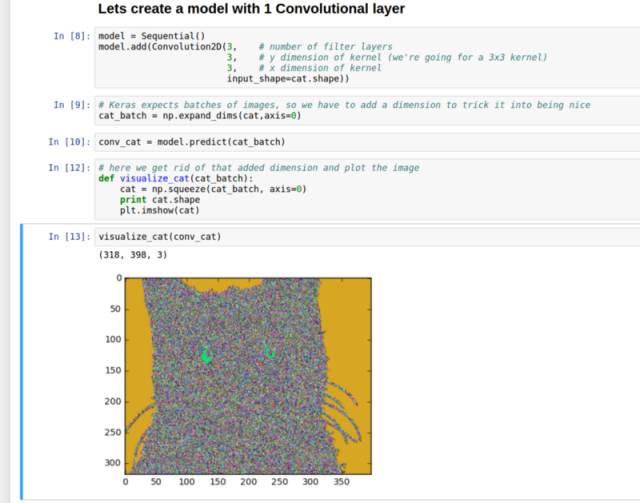 我们可以看到,图中的猫非常的模糊,因为我们使用了一个随机的初始值,而且我们还没有训练网络。他们都在彼此的顶端,即使每层都有细节,我们将无法看到它。但我们可以制作出与眼睛和背景相同颜色的猫的区域。如果我们将内核大小增加到10x10,会发生什么呢?