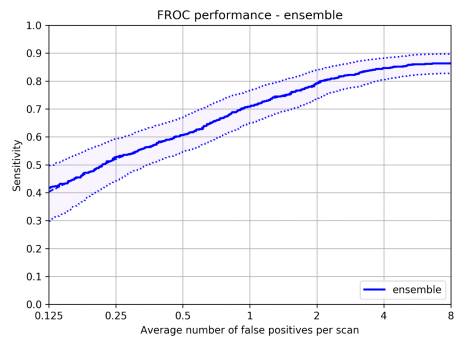 根据算法训练出的模型能够更好地处理不同形态的结节特征,达到很好的检测效果,在 400 例小结节测试数据上,FROC 曲线如图所示: