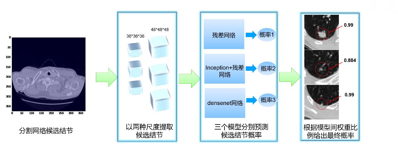 结节精检测采用三种模型分别预测候选结节概率,并根据模型间权重比例给出最终概率的方法。主要优势在于,负样本经历由易至难的学习过程,分割网络和后续假阳性衰减网络相辅相成。多结构类型的模型 Ensemble,且单一网络性能良好,类似于多个医生独立阅片的过程,综合给出阅片结果。