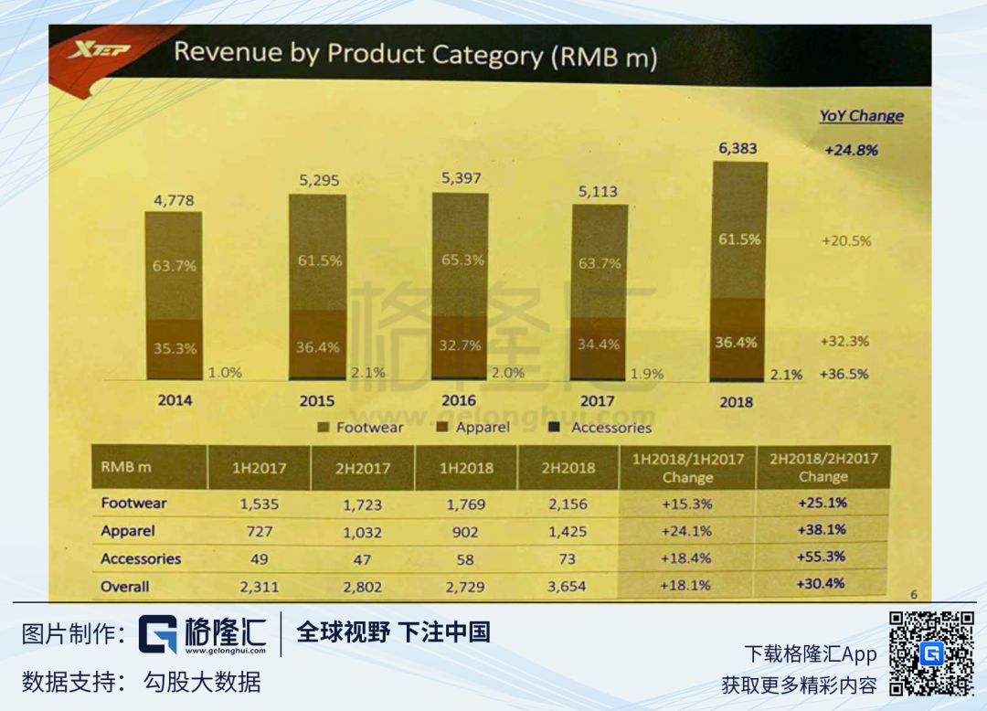 2018年产品组合优化了,过去偏向卖鞋,现在是整套贩售,未来会更加趋向平衡,有些产品是整套设计的话,会提高连带率,服装的销售比鞋子是要快的,2019年这个增长速度也会差不多,能够持续下去。2018年鞋子销售占比是61.5%,服装是36.4%,配饰是2.1%。