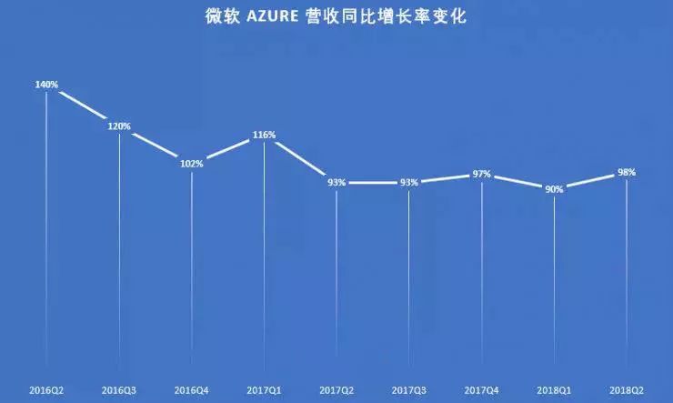 由上图可以看到,自有具体财报数据公布起,Azure 营收的同比增长就非常强劲,前期甚至达到了 140% ,而后期虽然有所下降,但依然高于 90% ,到了 2018 Q2 反而有所提升。联想到 2017 年 10 月微软正式宣布在中国推出 Azure Stack 混合云解决方案,这一提升可能与之有一定关系。