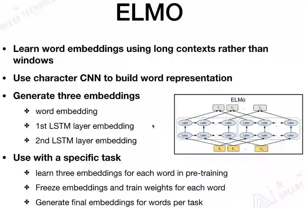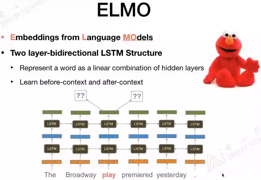 ELMo用的是long contexts信息,而不是其他模型用到的window size contexts信息。ELMo用到的是Bi-LSTM,如果ELMo换成Transformer那就和BERT结构基本一样了。